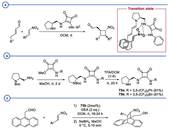 - Albrecht, Ł.; Dickmeiss, G.; Acosta, F.C.; Rodríguez-Escrich, C.; Davis, R.L.; Jørgensen, K.A. Asymmetric Organocatalytic Formal [2 + 2]-Cycloadditions via Bifunctional H-Bond Directing Dienamine Catalysis. J. Am. Chem. Soc. 2012, 134, 2543–2546. [Google Scholar] [CrossRef]