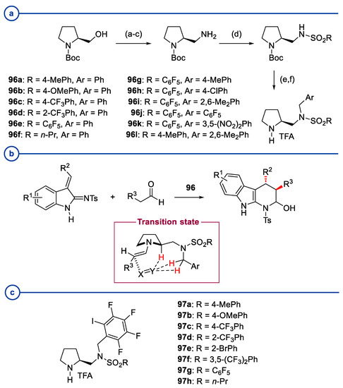We included the catalysts in which the structural variations involve the interaction with the substrates and, therefore, the transition state formation. The supported/immobilized/heterogeneous catalysts were considered beyond the scope of this survey of the literature, because the structural modifications are aimed at the catalyst’s recovery and reuse. Readers are kindly addressed to specific reviews covering the topic of pyrrolidine-based recyclable organocatalysts [21,22,23,24,25,26].