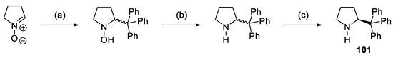 - Reddy, A.A.; Prasad, K.R. Addition of the Lithium Anion of Diphenylmethanol Methyl/Methoxymethyl Ether to Nonracemic Sulfinimines: Two-Step Asymmetric Synthesis of Diphenylprolinol Methyl Ether and Chiral (Diphenylmethoxymethyl)Amines. J. Org. Chem. 2018, 83, 10776–10785. [Google Scholar] [CrossRef] [PubMed]