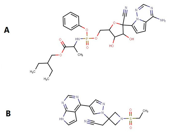 Chemical structure of (A) Remdesivir and (B) Baricitinib. MarvinSketch was used for drawing, displaying and characterizing chemical structures, MarvinSketch 21.18.0, ChemAxon (https://www.chemaxon.com (accessed on 10 October 2022)).