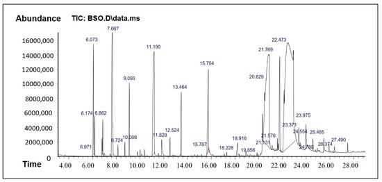 The results from the GC-MS analysis configured unknown compounds which were identified by comparing the spectra with that of the NIST 2008 (Table 1 and Table 2, Figure 2 and Figure 3). The total time required for analyzing a single sample was 29 min. The bioflavonoids and/or bioactive constituents were shown in Table 1 and Table 2. The data from BSO analysis in Table 1 showed a good amount of thymoquinone, which was eluted at 11.19 min. In addition, BSO comprised isoborneol, which has antiviral and antioxidant properties and is a potent inhibitor of herpes simplex virus [19]. BSO was also rich in paeonol, which is a pharmacologically active constituent that possesses anti-inflammatory, antibacterial, and analgesic activities.