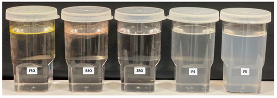 The resulting emulsions of F1–F3 formulations experienced poor homogeneity (oil floats on the water). In particular, F1 (FSO) and F2 (BSO) showed yellowish and reddish colors on the water surface (Figure 4), respectively. For poor dispersibility (large droplets) and hazy appearance, these F1–F3 formulations were not categorized as bio-SNEDDS and were instead named as oil-only formulations. However, due to the presence of nonionic surfactant Tween 80 (refined) and polar mixed mono- and di-glycerides (Imwitor 988) in formulations F4 and F5, the emulsions produced were fine (semi-transparent systems with no discernible particulates) following aqueous dispersion. These two formulations produced homogeneous emulsion droplets that were slightly bluish in appearance. However, the anhydrous state of F4 showed partial physical separation over time and was not completely miscible, which might be due to the presence of the natural crude oil FSO. Accordingly, only F5 showed complete excipients miscibility (in an anhydrous state) and homogenous aqueous dispersion (upon dilution) and, therefore, were tagged as bio-SNEDDS.