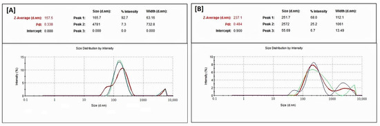 Malvern zetasizer particle size distribution data for F4 systems and F5 bio-SNEDDS; (A) FSO/I988/T80R (35/15/50) %w/w/w and (B) BSO/I988/T80R (35/15/50) %w/w/w, respectively.
