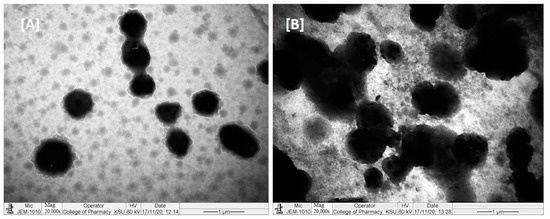 TEM micrographs of RMV and BRB loaded bio-SNEDDS formulations are shown in Figure 6. The TEM suggested a valuable interpretation of the surface morphology and globule size of the bio-SNEDDS. In the image, it was apparent from (A) that globules of the representative F4-systems and F5-bio-SNEDDS were well dispersed and had spherical shape. However, the F5-bio-SNEDDS was found to be larger and irregular in size.