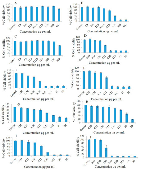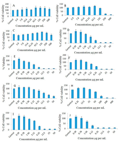 Effects of different concentrations of pure FSO (A), BSO (B), ZRO (C), F4- systems-loaded RMV (D), F4-systems-loaded BRB (E), F4-systems blank (drug free systems) (F), pure BRB (G), pure RMV (H), F4-systems-loaded with RMV and BRB (I), F5-bio-SNEDDS loaded with RMV and BRB (J) on the cell viability percentage of the MDA-MB-231 breast cancer cell line as measured using MTT 72 h following exposure.