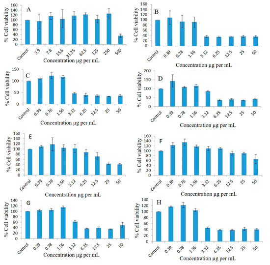 As illustrated in Figure 9D, the cell viability percentages of F4-blank (drug-free systems) were 143.48, 109.04, 115.52, 85.91, 37.51, 40.16, 36.25, and 44.15 at doses of 0.39, 0.78, 1.56, 3.12, 6.25, 12.5, 25, and 50 µg/mL, respectively, compared to the control. The pure BRB drug powder (Figure 9E) showed cell viability percentages of 109.79, 118.13, 105.07, 101.93, 87.89, 71.73, 43.77, and 41.58, whereas the pure RMV drug powder showed slightly higher cell survival percentages of 123.43, 135.13, 117.85, 109.67, 109.49, 90.4, 89.56, and 66.37 (Figure 9F) at doses of 0.39, 0.78, 1.56, 3.12, 6.25, 12.5, 25, and 50 µg/mL, respectively, compared to the controls.There was not any significant difference in cell survival noticed between F4-systems- and F5-bio-SNEDDS-loaded RMV and BRB. As illustrated in Figure 9G,H, F4-systems-loaded RMV and BRB provided cell viability percentages of 104.14, 105.42, 114.84, 62.56, 36.89, 38.83, 35.12, 49.23, and F5-bio-SNEDDS-loaded RMV and BRB provided 116.73, 122.18, 104.5, 45.6, 38.09, 38.49, 41.99, and 40.7 at doses of 0.39, 0.78, 1.56, 3.12, 6.25, 12.5, 25, and 50 µg/mL, respectively, compared to the controls.