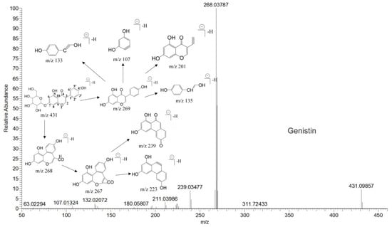 The mass spectrum information for four prototype drugs (genistin, genistein, daidzin and daidzein) were collected and resolved via the established analysis strategy. The metabolic profile of genistin is shown in Figure 1, and other compounds are shown in the Supplementary Figures S1–S3.