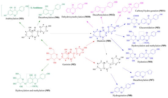 The proposed metabolic patterns of genistin in normal and hyperlipidemic rats. The parent nucleus of genistin was labeled with red; the common metabolites in hyperlipidemic and normal administration rats were labeled with green; metabolites in normal administration rats were labeled with blue; and metabolites in hyperlipidemic administration rats were labeled with pink.