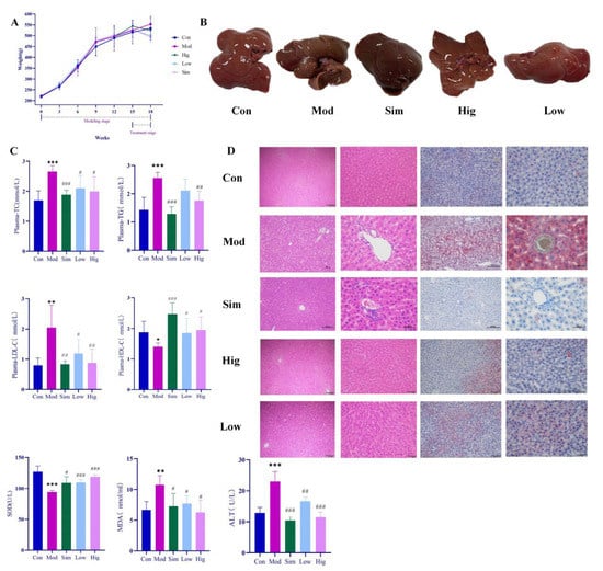 Results of anti-hyperlipidemia activity of genistin. Con: control group; Mod: high-fat diet group; Hig: genistin high dose treatment group; Low: genistin low dose treatment group; and Sim: simvastatin calcium administration group. (A) Statistics of body weight change in rats in test groups. (B) Rat liver photographs in test groups. (C) Hypolipidemic effect of genistin (TC, TG, LDL-C, HDL-C, ALT, SOD, and MDA levels in the plasma of rats). (D) The results of H&E staining (left, 100 μm and 400 μm) and Oil Red O staining (right, 200 μm and 400 μm). n = 6. * p < 0.05, ** p < 0.01, and *** p < 0.001, Con vs. Mod; and # p < 0.05, ## p < 0.01, and ### p < 0.00, Sim vs. Mod, Hig vs. Mod, Low vs. Mod.