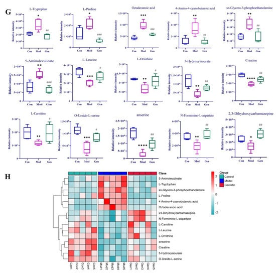 The following supporting information can be downloaded at: https://www.mdpi.com/article/10.3390/molecules28052242/s1, Figures S1–S3: the metabolic profiles of daidzin, daidzein, genistein; Table S1: approximate values of fold changes of metabolites in the studied groups; Table S2: identified potential biomarkers regulated by genistin and their fragment ion information.