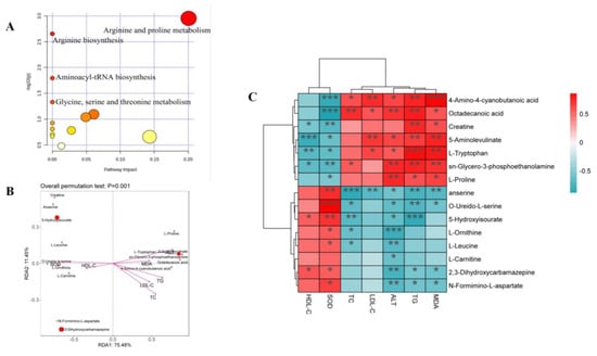 Among those metabolites, only creatine could show the negative correlation with the above three factors (p < 0.01) and was positively correlated with HDL-C (p < 0.05). The result suggested that creatine seemed to show a unique function in alleviating hyperlipidemia. Moreover, the correlations between creatine and SOD and MDA also confirmed that creatine could inhibit lipid peroxidation in the liver. Other metabolites that could demonstrate this function were anserine, 2,3-Dihydroxycarbamazepine, and N-Formimino-L-aspartate (p < 0.05).