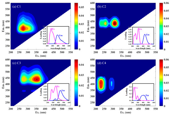 Four fluorescence components ((a) C1, (b) C2, (c) C3, and (d) C4) and their spectral loadings of BDOC were obtained using EEM-PARAFAC analysis.