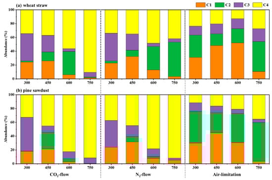 A high H/C ratio represents a low aromaticity and a high aliphaticity [38]. As shown in Table 1, an increasing temperature supported a decreased aliphaticity of biochar, except for the wheat straw biochar produced in air limitation (at 750 °C, it showed a sharp increase in aliphaticity). At 300~450 °C, pine sawdust biochar pyrolyzed in CO2 and N2 flows had a greater aliphaticity compared with that pyrolyzed in air limitation, while at 600~750 °C, the aliphaticity difference among the biochars from different pyrolysis atmospheres was narrowed. Meanwhile, wheat straw biochars from the three pyrolysis atmospheres showed a minimal difference in aliphaticity at 300~450 °C; however, at 600~750 °C, wheat straw biochar pyrolyzed in air limitation supported higher aliphaticity than that pyrolyzed in N2 and CO2 flows. This is because in comparison with CO2 and N2 flows, air limitation preferred to oxidize the aliphatic matter of lignin at 300~450 °C for pine sawdust; meanwhile, at 600~750 °C, the aliphatic matter of lignin could be decomposed in all studied pyrolysis atmospheres for pine sawdust [1,39,40]. Differently, the hemicellulose containing aliphatic matter with low thermostability was able to decompose in all three studied atmospheres at 300~450 °C for wheat straw [33]. A lower (N+O)/C value represents a lower polarity [17]. Table 1 presented that with the temperature being increased from 300 to 600 °C, the (N+O)/C value of biochar decreased, then it was increased at 750 °C. Pine sawdust biochars pyrolyzed in air limitation presented a higher polarity than those pyrolyzed in N2 and CO2 flows. Differently, wheat straw biochars presented the polarity orders of CO2 flow ≈ N2 flow < air limitation at 600~750 °C and N2 flow < air limitation < CO2 flow at 300~450 °C. The mechanisms of pyrolysis conditions controlling the polarity of biochar were identical to the mechanisms of pyrolysis conditions controlling the O content of biochar mentioned above.