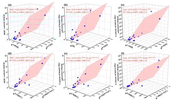 The quantitative relationship between the characteristics of BDOC (bulk DOC (a,d), humic-like substances (HAs) (b,e), and fulvic-like substance (FAs) (c,f) contents) and the exponential properties (H and O contents (a–c), H/C and (O+N)/C) (d–f) of biochar. SSR indicates sum of squared residual.