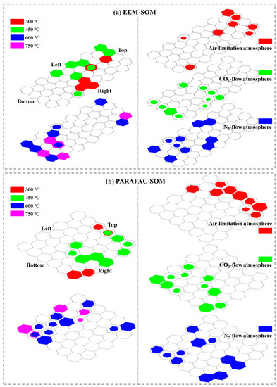 The unified distance matrix (U-matrix) and the mapping distribution map (Figure S2 from Supplementary Materials) presented the EEM distribution characteristics of BDOC samples in each neuron that can be obtained by SOM training. The U-matrix describes the degree of similarity (measured by Euclidean distance) between neurons as additional regular hexagonal elements [23]. In the U-matrix, the redder color (the larger the distance value) indicated a greater difference in fluorescence properties between neighboring neurons, which was helpful to determine the borders of the clusters [26]. In the vertical direction, the sample map (Figure S2 from Supplementary Materials) comprised two parts. In the multiple hits map (Figure 5a (left)), BDOC samples pyrolyzed at 300 °C (red) and 450 °C (green), located on the top of the map, could be classified into a cluster, while BDOC samples pyrolyzed by 600 °C (blue) and 750 °C (purple), mainly located on the bottom of the map, could be classified into another cluster. In Figure 5a (right), BDOC samples from air-limitation pyrolysis (red) were distributed on the top of the map could be classified into a cluster, while BDOC samples from CO2-flow (green) and N2-flow (blue) pyrolysis were distributed on the bottom of the map and could be classified into another cluster. In addition, the fluorescence intensity of the samples distributed on the top was higher than that on the bottom (Figure S3 from Supplementary Materials), which indicated that substances with higher fluorescence intensity occurred in low-temperature pyrolysis and air-limitation pyrolysis BDOC. These results were in line with those of the PARAFAC analysis (Section 3.4).