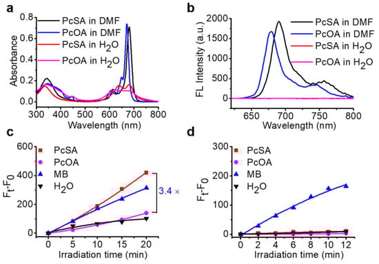Photophysical and photochemical properties of PcSA and PcOA. (a) Absorption and (b) fluorescence spectra of PcSA and PcOA (both at 4 μM) in DMF. FL, fluorescence. The capacity of PcSA, PcOA, and MB (all at 4 μM) in water to generate (c) O2∙− and (d) 1O2 under light irradiation. Water was used as control.