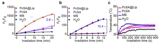To investigate the photosensitive activity of PcSA@Lip, we examined the generation of O2∙− and 1O2 in water using a dihydroethidium (DHE) probe and a singlet oxygen sensor green (SOSG) probe, respectively [42,44,45]. According to Figure 3a,b and Figure S13, PcSA@Lip displayed a significantly improved ability to produce ROS through type I and type II mechanisms compared to the known PS MB. Moreover, PcSA@Lip produced 2.6 and 15.4 times more O2∙− and 1O2 under light irradiation than those of PcSA, respectively. PcSA@Lip showed a significant increase in the generation of O2∙− and 1O2 in aqueous solution probably due to the aggregation inhibition and the more photons absorption. In addition, Figure 3c showed that PcSA@Lip and PcSA in water both had no significant photothermal conversion capability.