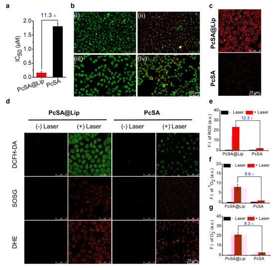 To further investigate the intracellular ROS production by PcSA@Lip and PcSA, fluorescein 2,7-dichloroacetate (DCFH-DA) was used as a fluorescent probe to monitor ROS production in HepG2 cells incubated with PcSA@Lip and PcSA before and after light irradiation. As demonstrated in Figure 4d,e, the ROS produced by PcSA@Lip was about 12.3 times more than that of PcSA. In addition, we further used the SOSG probe and DHE probe to explore the species of ROS produced by PcSA@Lip and PcSA in HepG2 cells. Interestingly, both PcSA@Lip and PcSA could generate O2∙− and 1O2, and there is a significant improvement of PcSA@Lip to produce ROS by type I and type II methods compared to PcSA (Figure 4f,g). These results further demonstrated that PcSA@Lip could generate ROS through type I and type II photoreaction in vitro.