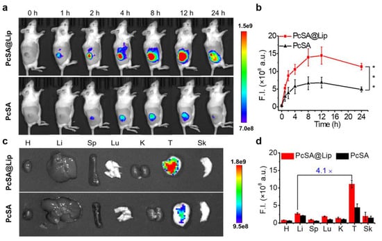 Fluorescence imaging of PcSA@Lip and PcSA in vivo. (a) In vivo fluorescence images of tumor-bearing H22 mice before and after intravenous injection of PcSA@Lip and PcSA ([PcSA] = 200 μM, 100 μL per mouse). (b) Quantification of fluorescence intensities at tumor sites after intravenous injection of PcSA@Lip and PcSA. F.I., fluorescence intensity. (c) Ex vivo fluorescence images and (d) quantification of fluorescence intensities of tumor-bearing H22 mice before and after intravenous injection of PcSA@Lip and PcSA. H, heart; Li, liver; Sp, spleen; Lu, lung; K, kidney; T, tumor; Sk, skin. Data were shown as the mean ± standard deviation, n = 3. *** p < 0.001 determined using Student’s t-test.