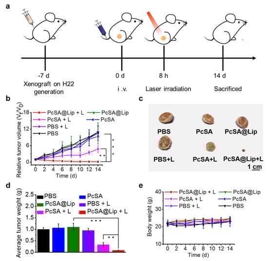 Photodynamic anticancer treatment with PcSA@Lip and PcSA on H22 tumor-bearing mice. (a) A schematic chart demonstrating the treatment of PSs on H22 tumor-bearing mice. The orange color dot represents the tumor. (b) Tumor growth curves of tumor-bearing mice in different treatment groups. (c) The tumor pictures and (d) the average tumor weight of the mice after 14 days of treatment. (e) Mean body weight curve of tumor-bearing mice during treatment. L: 680 nm laser, 0.1 W/cm2, 5 min. Data were shown as the mean ± standard deviation, n = 5. ** p < 0.01, *** p < 0.001 determined using Student’s t-test.