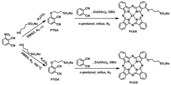 Phthalocyanine has already emerged as a promising second-generation PSs due to strong absorption in the visible and near-infrared regions (600–800 nm) and ease of structural modification [35,36]. It is an urgent requirement to achieve dispersibility and higher ROS generation in an aqueous solution in order to reach a broader application of phthalocyanines. Wen et al. developed type I photodynamically enhanced thiophene isoindigo derivatives by modulating sulfur group elements [37]. Studies have shown that the modification of zinc(II) phthalocyanines in the alpha position with the “O bridge” and “S bridge” as bonds causes a red shift in the absorption and fluorescence spectra because of the electron-donating ability of “O” and “S” atoms [19,38,39]. Therefore, as shown in Scheme 1, we synthesized two monosubstituted sulfonate-modified zinc(II) phthalocyanines in the alpha position using “S bridge” and “O bridge” as the linkages (PcSA and PcOA), respectively. The detailed synthesis and characterization of PcSA and PcOA are shown in the supporting information (Figures S1–S8).