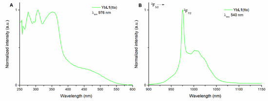 Luminescence excitation spectrum of (R,R)-YbL1(tta) in methanol solution (λem = 976 nm) (A) and luminescence emission spectrum of (R,R)-YbL1(tta) in methanol solution (λexc = 540 nm) (B). The spectra of (S,S) enantiomer (not reported) are superimposable.