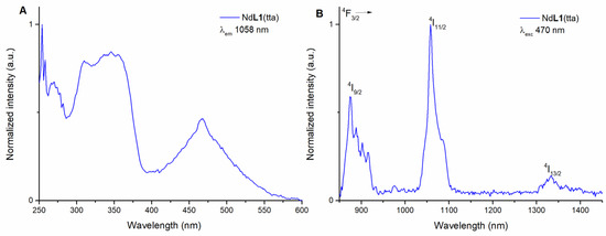 Luminescence excitation spectrum of (R,R)-NdL1(tta) in methanol solution (λem = 1058 nm) (A) and luminescence emission spectrum of (R,R)-NdL1(tta) in methanol solution (λexc = 470 nm) (B). The spectra of (S,S) enantiomer (not reported) are superimposable.