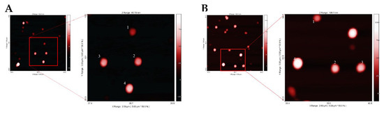AFM images related to: PLGA(R,R)-YbL1(tta): magnification of four nanoparticles with size close to AFM diameter mean (138 nm (1), 157 nm (2), 162 nm (3), 182 nm (4)) (A); PLGA(R,R)-NdL1(tta): magnification of four nanoparticles with size close to AFM diameter mean (150 nm (1), 169 nm (2), 191 nm (3), 202 nm (4)) (B).
