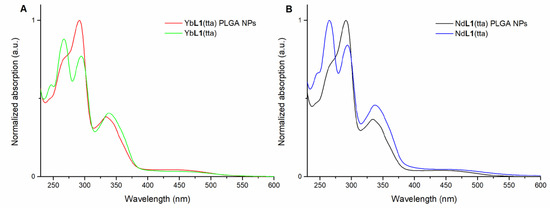 The UV-visible spectra of the aqueous suspensions of YbL1(tta)- and NdL1(tta)-loaded PLGA NPs are reported in Figure 5A,B, respectively, together with those of the solutions of the complexes in methanol. The nature of the electronic transitions has been previously studied and discussed in detail [16].