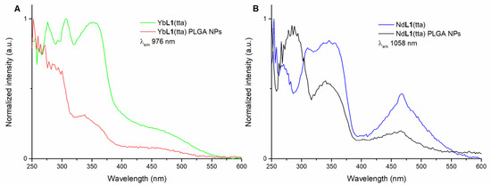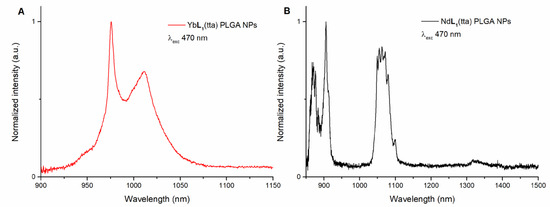 Furthermore, another proof of the preserved identity of both the Yb(III)- and Nd(III)-based complexes when encapsulated in the PLGA NPs, is given by the luminescence emission spectra (Figure 7), since they are fully consistent with the relative ones previously collected in methanol. Again, the emission spectra were collected by exciting in both UV and visible regions. More in detail, PLGA NPs containing the Yb(III) complex were excited at 340, 470, and 540 nm (Figure 7A and Figure S3), while the ones involving the Nd(III) counterpart were excited at 340 and 470 nm (Figure 7B and Figure S4).