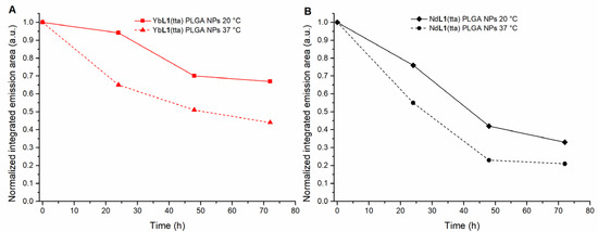 Evolution over the time (0 → 72 h) of the Ln(III) normalized integrated emission intensity for YbL1(tta) (λexc = 470 nm, λem = 976 nm) (A) and for NdL1(tta) (λexc = 470, λem = 1058 nm) (B), both embedded in PLGA, at two different temperatures (20 °C and 37 °C) in aqueous suspension.