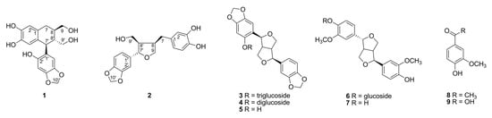 - Saleem, M.; Kim, H.J.; Ali, M.S.; Lee, Y.S. An update on bioactive plant lignans. Nat. Prod. Rep. 2005, 22, 696–716. [Google Scholar] [CrossRef] [PubMed]