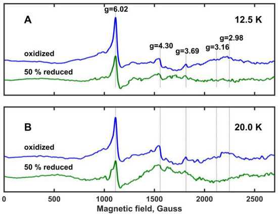 Electron paramagnetic resonance (EPR) spectra of oxidized and ~50% reduced Mm_CYB561D1 are shown in Figure 5 at temperatures 12.5 K and 20 K (panels A and B, respectively). These spectra are very similar to those obtained for the oxidized Hs_CYB561D2 at different temperatures [26] and, with one exception, the observed spectral peaks correspond well to previously assigned ones for other members of the di-heme cytochrome b561 protein family [30,32,34]. The characteristic g-values are marked and are shown with vertical lines. As expected, all spectral peaks are more intense at 12.5 K than at 20 K (which means a factor of 1.6 in kT between these temperatures). The peak at gz = 4.30 has been assigned to non-heme iron and it is frequently observed in biological samples. The peak at gz = 6.02 shows the presence of high spin ferric iron, and it has been associated with protein degradation. Protein degradation may be the result of the fact that the samples were stored at −80 oC before the measurements. Despite its apparent intensity, this peak represents a minor component because of the spin-quantum-number-dependence of the EPR intensity [30]. The gz = 4.30 and gz = 6.02 peaks are of no interest for further considerations. However, the peak at gz = 3.69 is rather prominent. At both temperatures, it loses most of its intensity but does not fully vanish upon ~50% reduction of Mm_CYB561D1. No significant EPR peak is present around gz = 3.16, a signal usually assigned to rhombic heme environments in other cytochrome b561 proteins. A relatively broad and very weak peak might be present around gz = 2.98, which vanishes or changes upon ~50% reduction, but this peak is not sufficiently clear. It has also been assigned earlier to protein degradation [30]. These observations suggest that in Mm_CYB561D1 both hemes have a highly asymmetric low-spin (HALS) character [9].