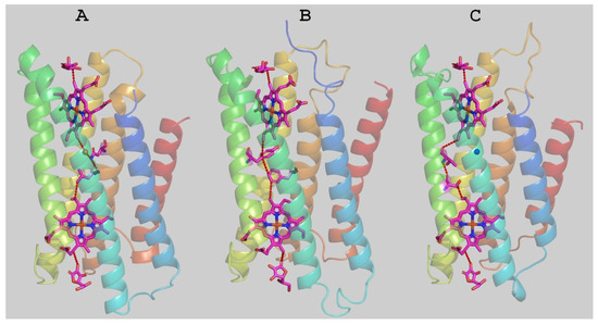 Experimental crystal structures of the Arabidopsis thaliana CYB561B2 (A) and the human duodenal CYB561A2 (B), as well as the homology modelled structure of Mm_CYB561D1 (C). The calculated best electron transfer pathways are seen with dashed red lines representing hydrogen bonds or through space jumps.