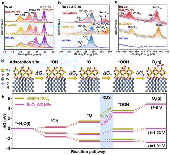 XPS spectra of RuO2–WC NPs, Ru–WC NPs and WC NPs. High-resolution XPS spectra of (a) W 4f, (b) Ru 3d and C 1s, and (c) Ru 3p. (d) Mechanism of OER process steps and corresponding Gibbs free energies of reaction intermediates on RuO2–WC NPs. (e) Free energy landscape of pristine RuO2 and RuO2–WC NPs at zero potential (U = 0), equilibrium potential (U = 1.23 V), and the potential (U = 1.91 V) for which each step is downhill of RuO2–WC NPs, respectively [86].