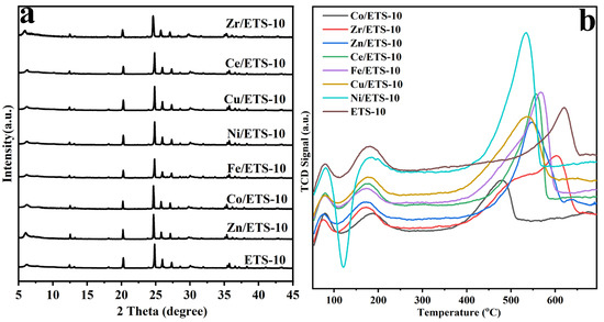 (a) XRD patterns and (b) CO2-TPD profiles of different ETS-10 zeolite-based catalysts.