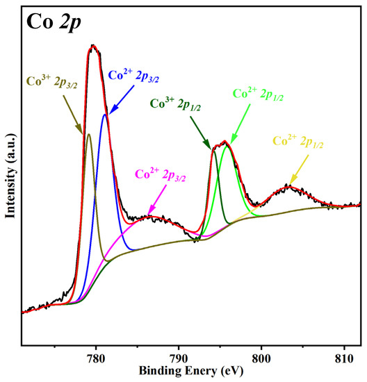 The surface composition and chemical bonding states of the metal active sites on Co/ETS-10 were then determined by XPS. As can be seen from Figure 3, there are six characteristic peaks from the Co 2p XPS spectrum. The peaks at 779.6 eV and 794.2 eV are affiliated to Co 2p3/2 and Co 2p1/2 for Co3+ species. Another two characteristic peaks appearing at 781.4 and 796.1 eV are attributed to Co 2p3/2 and Co 2p1/2 for Co2+ species, which are accompanied by two shake-up satellite peaks located at 786.0 eV and 802.9 eV. Interestingly, when compared with the XPS spectra of Co3O4 reported previously [35,36], the peak positions for Co3+ species in Co/ETS-10 are shifted toward lower binding energies, suggesting a possible existence of electron transfer between the Co species and the ETS-10 zeolite support. Furthermore, according to the semi-quantitative analysis, the surface concentrations of Co2+ for Co/ETS-10 is 73%, higher than that for Co3O4 reported (69%), indicating the lower average oxidation valence state of the cobalt species presented in Co/ETS-10 [37,38]. This may be related to the coordination interaction between Co species and TiO6 building units with two negative charges in ETS-10 zeolite.