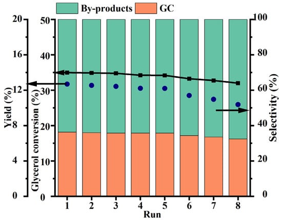 As presented in Figure 4e, even though there was obvious growth that occurred on the glycerol conversion with the reaction time prolonged, the rise in GC selectivity unexpectedly derailed, which was maximized at 6 h and then began declining gradually accompanied by an increased formation of glycerol monoacetate. This may be related to the side reaction of the active hydroxyl group on GC and acetic acid from CH3CN hydrolysis. Additionally, it is possible that with the presence of more and more GC in the reaction system, self-polymerization took place to produce oligomers under the given reaction conditions, which accordingly brought down the GC yield.
