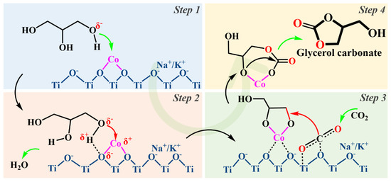 On account of the discussion above and referring to those previous reports [20,40,51,52], a feasible mechanism was proposed for the coupling process of GC synthesis. As is shown in Scheme 1, the oxygen atom on the hydroxyl group of glycerol attacked the Co species to produce cobalt glycerate and water molecules as main intermediates. At the same time, the activated CO2 adsorbed on the basic sites (TiO62−) of ETS-10 zeolite was inserted into the cobalt glycerate to form another important intermediate of the seven-membered ring, which then underwent intramolecular rearrangement for the target product GC coming into being. This process proceeded smoothly mainly thanks to the multiple catalytically active centers constructed by the suitable interaction between the cobalt species and the ETS-10 framework, which indeed fulfilled the requirement for simultaneous activation of CO2 and glycerol with high efficiency.