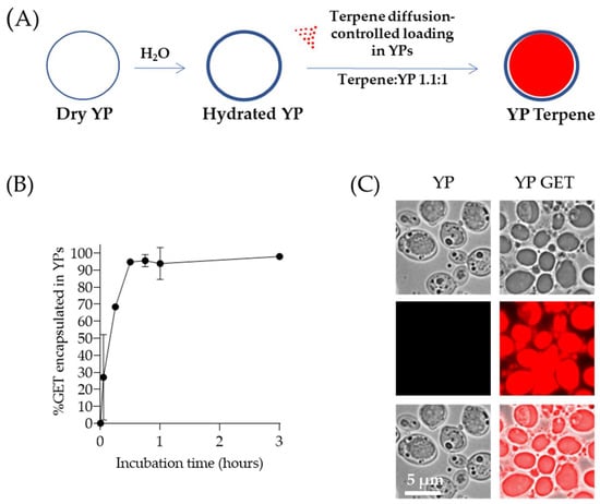 (A) Schematics of diffusion-controlled terpene loading in YPs, (B) kinetics of 2:1:2 GET loading in YPs quantified by HPLC of samples prepared at a GET:YP ratio of 1.1:1 in a homogenized YP suspension (final concentration of 150 g YP/L, 16.5% GET), and (C) microscopy images of Nile red-stained YP control (t = 0) and YPs loaded with GET after 1-h incubation. Brightfield images show a droplet inside YP GET, and Nile red staining of hydrophobic terpene confirms this droplet corresponds to a terpene droplet loaded in YPs. Figures adapted from Reference [40] and reproduced with permission from MDPI.