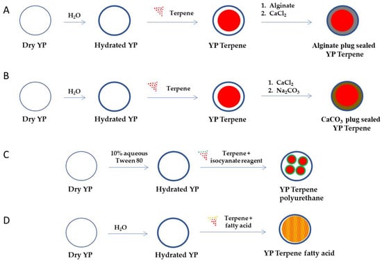 Schematic representation of steps required to encapsulate terpenes in YPs using (A) an alginate plug seal, (B) calcium carbonate plug seal, (C) encapsulation of terpenes in polyurethane nanoparticles, and (D) co-encapsulation with fatty acids (YP–terpene fatty acid can also be prepared by sequential loading of fatty acid and then the terpene).