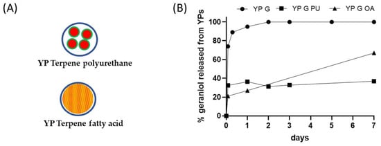 (A) Schematics of YP–terpene formulations prepared by encapsulation of terpene in polyurethane or co-loading of terpene with a fatty acid, and (B) kinetics of geraniol release from YP samples at 25 °C in YP–terpene suspensions at total geraniol concentration of 1 mg/mL (YP G: YP geraniol, YP G PU: YP geraniol polyurethane, YP G OA: YP geraniol oleic acid).
