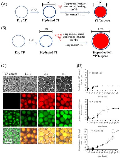 Schematics of diffusion-controlled terpene loading in YPs at terpene:YP ratios of (A) 1.1:1 and (B) 5:1. (C) Microscopy images showing FITC–concanavalin A stained YPs and Nile red stained terpenes in empty YP control and YP GETs loaded at GET:YP ratios of 1.1:1, 3:1, and 5.1. (D) Cumulative GET release from YPs showing extension of wetting/terpene release cycles in YP GET 1.1:1 and hyper-loaded YP GET at ratios of 3:1 and 5:1 GET:YP. Figures adapted from Reference [40] and reproduced with permission from MDPI.