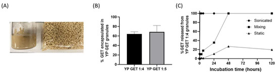 (A) Picture of homogenized aqueous suspension of YP GET 1:4 and YP GET 1:4 granules, (B) encapsulation efficiency of GET 2:1:2 in YP GET granules, and (C) GET release from YP GET 1:4 granules suspended in water at 1 mg GET/mL at room temperature under three incubation conditions.