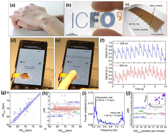 (a) Illustration of transparent and flexible GQD photodetector implanted in an HR tracking wristband. (b) A zoomed-in view of stretchable photodetector on polyethylene naphthalate substrate with a 1 mm2 graphene channel entirely encased in a thin 30 nm-thick coating of PbS QDs. (c) Schematic representation of graphene and QD setup on a flexible substrate assembly. Photodetection in graphene/PbS QD heterostructure-based health patches for wearable fitness via HR and RR monitoring: (d,e) a mobile-phone screen with an adaptable health patch. (f) Signals from photoplethysmography (PPG) at 630 and 940 nm. (g) Two simultaneous readings of a health patch and a cutting-edge PPG sensor. (h) Bland–Altman assessment of the patch (i) Fourier transforms of PPG’s. (j) Bland–Altman evaluation of the obtained RR. Adapted with permission from Ref. [145]. Copyright 2019, AAAS.