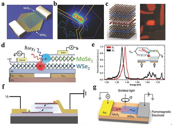 - Withers, F.; Del Pozo-Zamudio, O.; Mishchenko, A.; Rooney, A.P.; Gholinia, A.; Watanabe, K.; Taniguchi, T.; Haigh, S.J.; Geim, A.K.; Tartakovskii, A.I.; et al. Light-emitting diodes by band-structure engineering in van der Waals heterostructures. Nat. Mater. 2015, 14, 301–306. [Google Scholar] [CrossRef]