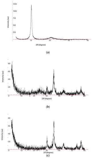 XRD patterns of (a) GO, (b) rGO, and (c) mrGO. X axis:2θ (degree), Y axis: Intensity (au).