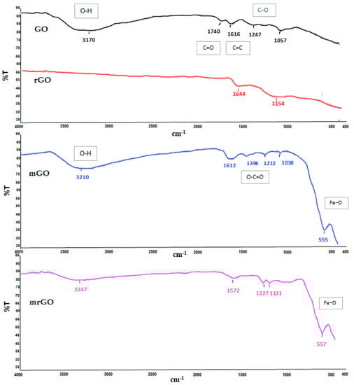 Fourier transform infrared spectroscopy (FT-IR) spectra provide information about the functional groups of the synthesized materials. The FT-IR spectra of the prepared GO based materials are shown in Figure 2. The GO and mGO spectra are characterized by a broad peak at 3170 cm−1 and 3210 cm−1, respectively, which is assigned to the O–H stretching vibrations of the hydroxyl group. The peak at 1740 cm−1 corresponds to the carbonyl or carboxyl groups (C=O), and that at 1616 cm−1 refers to the aromatic C=C bonds. Moreover, the C–O stretching vibrations of the epoxy group and alkoxy were observed at 1247 cm−1 and 1057 cm−1, respectively [24]. These characteristic bands in the GO spectrum were attributed to the oxidation process which has introduced strong oxygen-containing functional groups in the initial graphite. On the other hand, all the absorption bands related to the oxidized groups were significantly diminished or even disappeared in the FT-IR spectrum of rGO, indicating the successful reduction of graphene oxide. In the FT-IR spectrum of mGO, adsorption bands that characterized the GO spectrum were also observed, but the positions of the bonds were slightly shifted and the sharpness of the peaks has changed, indicating the change in the coordination environment of various functional groups in mGO [25]. An additional peak observed at 1396 cm−1 can be assigned to O–C=O carboxyl bonds (COO-symmetric vibration). Finally, in the low frequency region, a new peak appeared at 555 cm−1 which corresponds to the stretching vibration of the Fe−O, implying that Fe3O4 is attached with the O–C=O—group on the edge of the GO [26]. As far as concerns the FT-IR spectrum of mrGO (Figure 2), in accordance with rGO, the decrease of the peaks attributed to oxygen-containing functional groups confirms the reduction. The peaks at 1227 cm−1 and 1121 cm−1 correspond to the epoxy and alkoxy groups, while the peak at 1574 cm−1 is attributed to the aromatic C=C bonds. Finally, as for mGO, the existence of Fe3O4 is confirmed by the strong band at 557 cm−1, characteristic of the Fe–O bond.