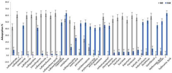 Some preliminary absorption experiments were conducted to investigate the sorption capacity of the synthesized materials on the target emerging contaminants (ECs). All the adsorption experiments were performed in a series of 15-mL tubes containing 10 mg of each magnetic sorbent (Fe3O4@GO and C18@SiO2@Fe3O4). Ten (10) mL of aqueous pharmaceutical standard solution with an initial concentration of 50 μg/L at a neutral pH was used. All the mixtures were placed in a shaker platform and were mixed for one hour at room temperature. After one hour the adsorbents were isolated from the solution using a strong magnet and the analytes were eluted with2 mL of methanol, applying 15 min of stirring. Finally, an aliquot of the eluent was injected in a UHPLC-Orbitrap-MS system. Figure 4 shows the sorption performances of the magnetic nanoparticles (MNPs), Fe3O4@GO and Fe3O4@SiO2@C18, towards selected analytes. All the experiments were conducted in triplicate. The average values were used.