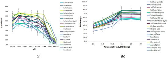 As shown in Figure 5a, the ECs gradually rise when increasing the pH from 2.0 to 3.0 and then decrease with the further increase of the pH from 4.0 to 6.0. At pH 6.5–7.0 a minor increase is presented, while the adsorption recovery of sulfonamides (SAs) decreased considerably when the pH peaked at a range from 8.5 to 11.5. The optimum pH for SA adsorption is 3.0–3.5; at pH values close to 3.0–3.5, the neutral and positively charged form of SAs co-exist according to their dissociation constant. In addition, the speciation of the GO functional group changes as well with pH variations. Typically, the alkyl carboxyl (COOH) functional group has a pKa of 4.5. Thus, at a pH of 3.0–3.5, almost all the carboxyl groups are protonated with natural charge (-COOH) [27].